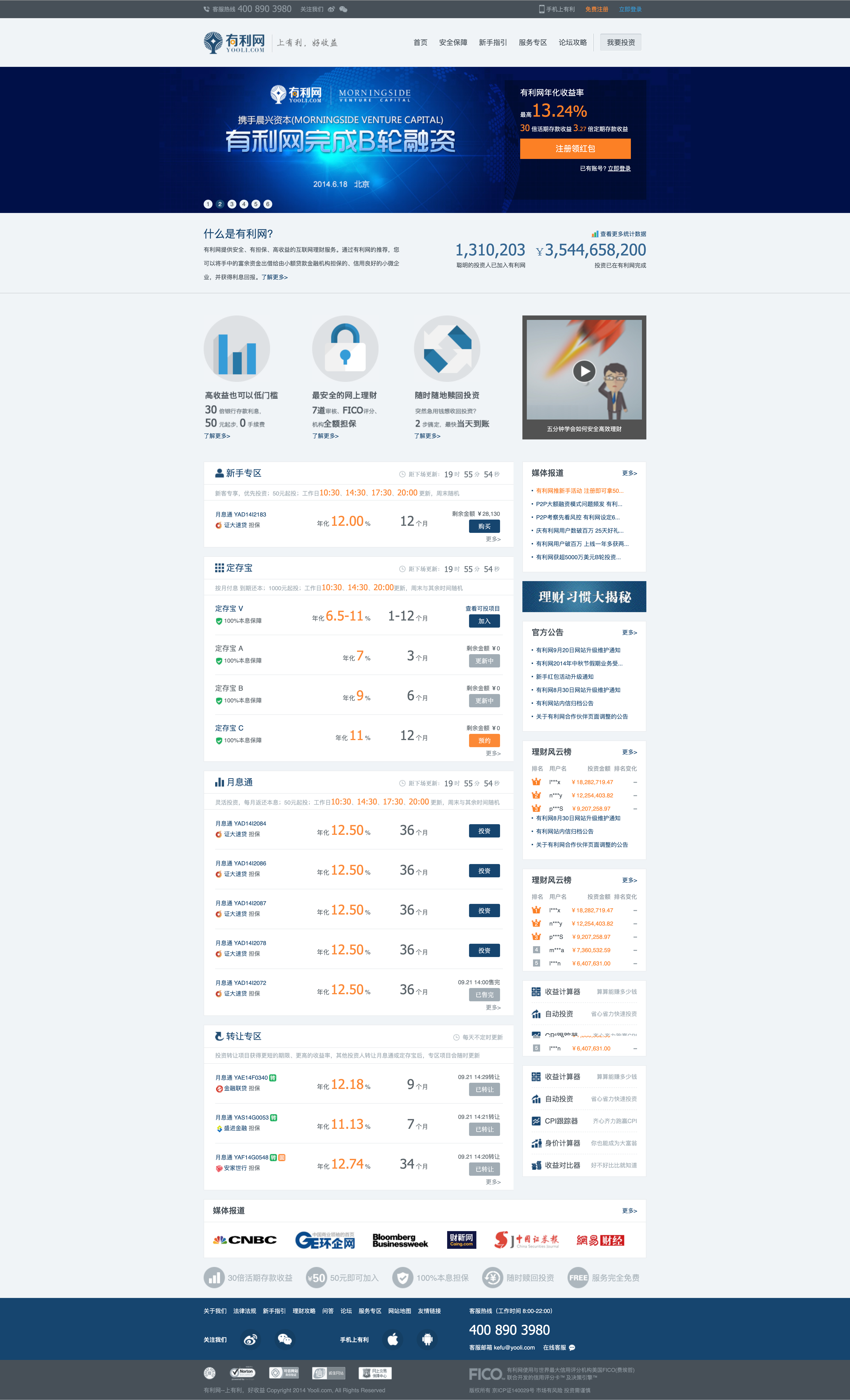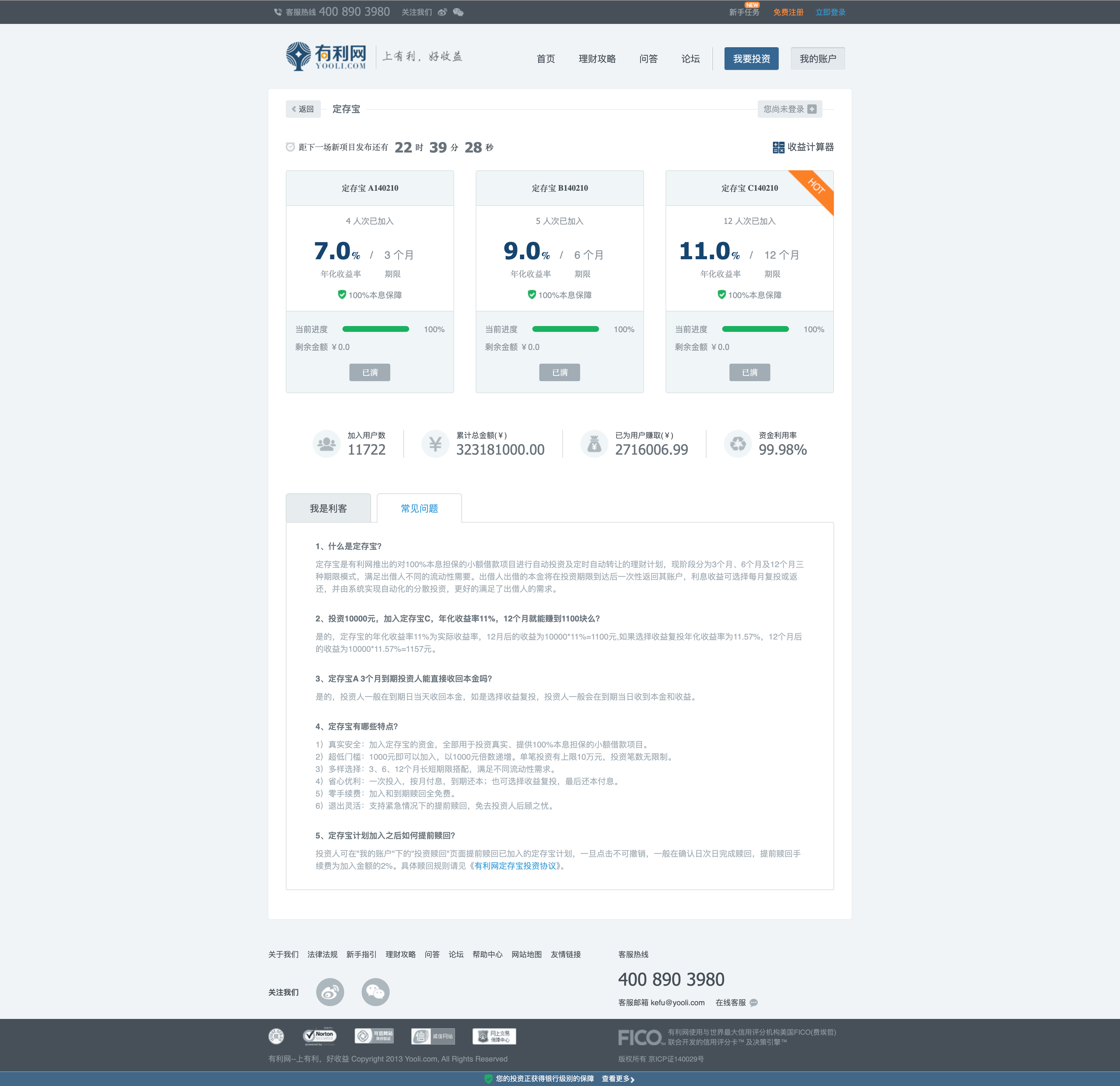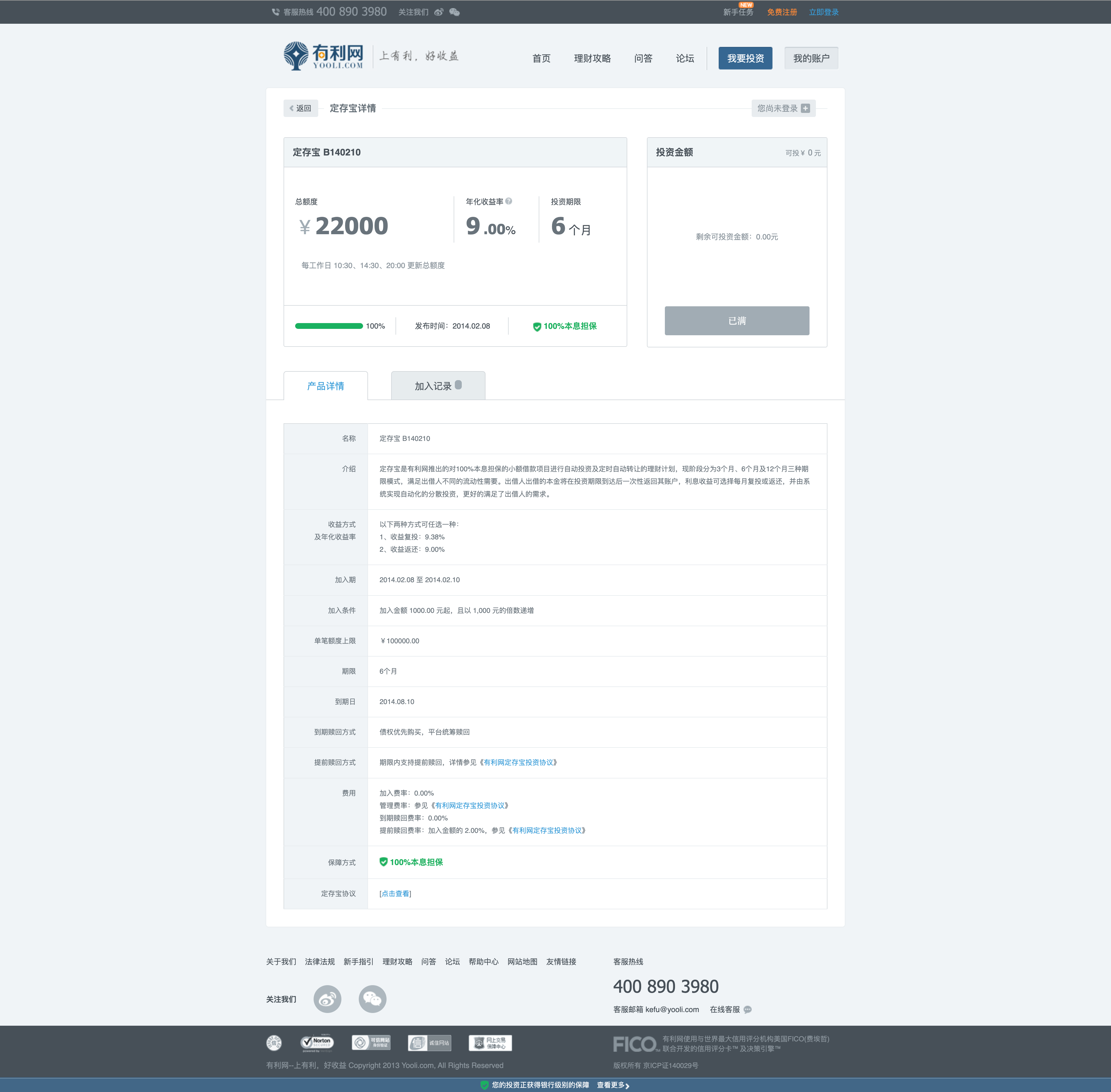 本证据为2014年有利网官方网站多个页面的截图,展示了该平台在官网各类产品介绍和首页宣传中,持续使用“100%本息保障”等类似表述进行宣传,包括但不限于定存宝、月息通等产品。其目的在于吸引出借人投资,营造“资金无风险”的安全假象。 尤其需要指出的是,在2014年9月21日官网首页改版后,定存宝产品仍然被显著标注为“100%本息保障”,说明该宣传策略不是短期行为,而是从2013年上线到2014年年末,贯穿整个集中拉新扩张阶段的长期官方行为。